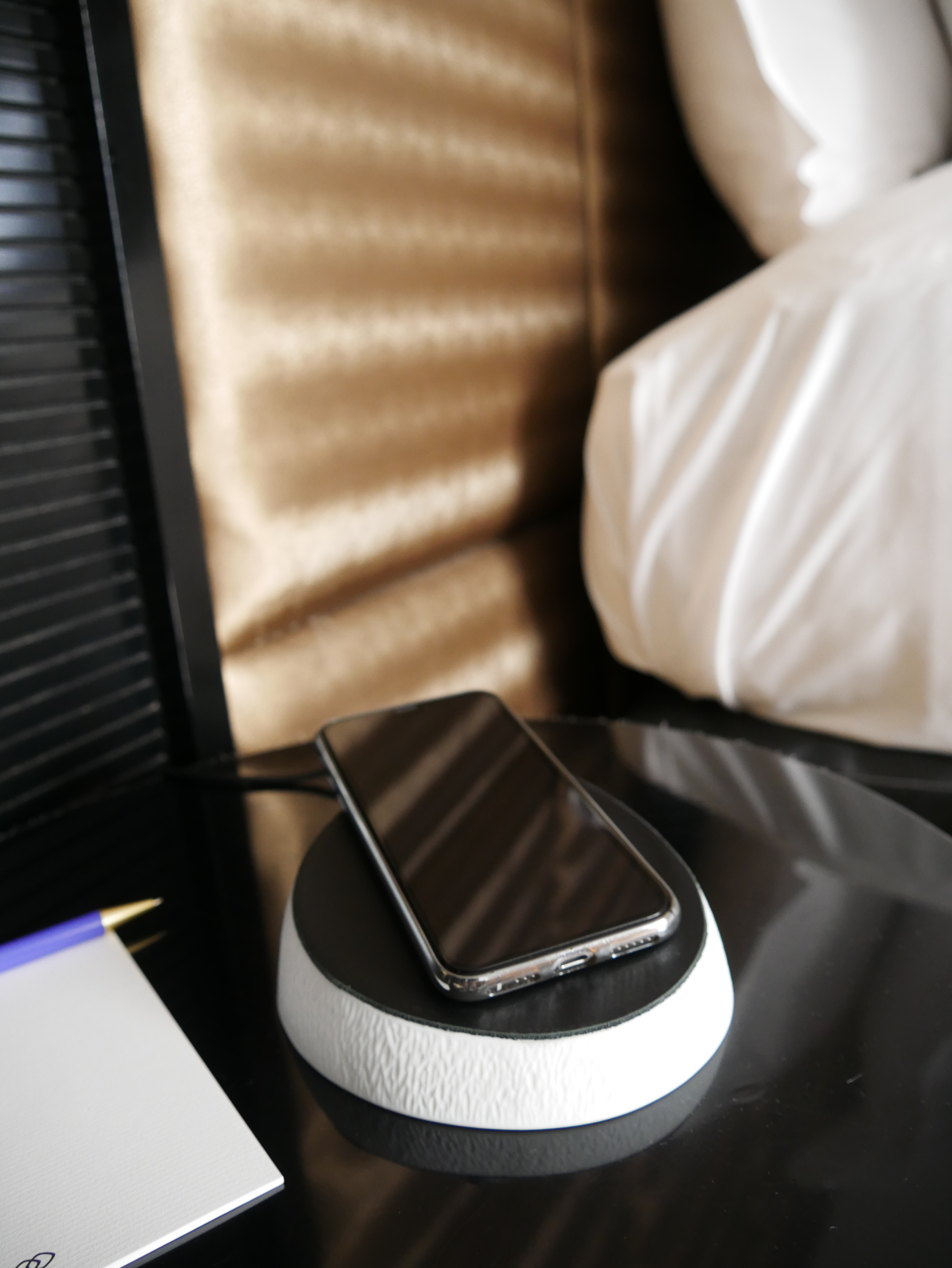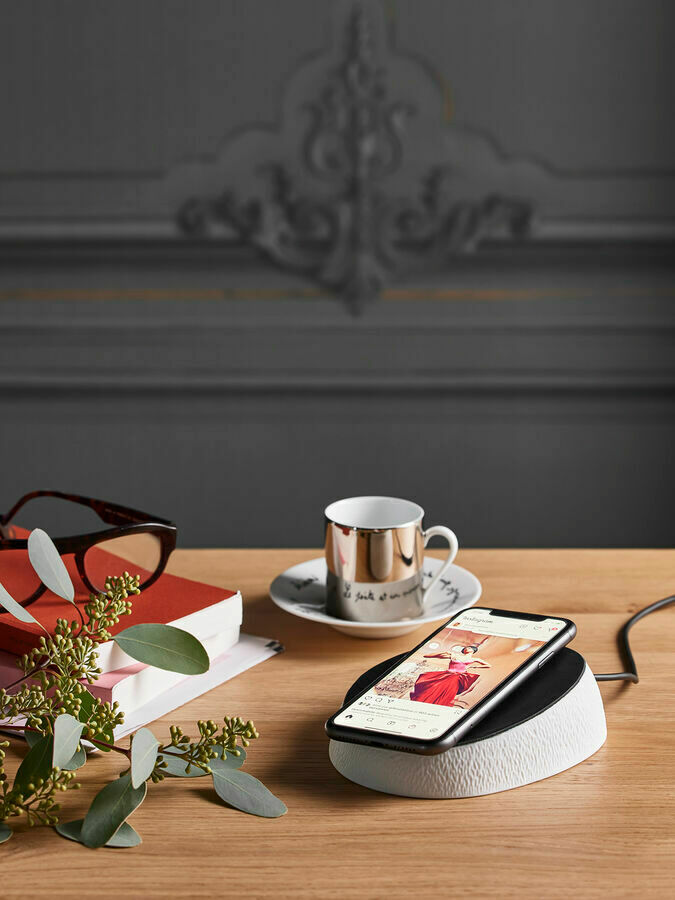 Raynaud elevates technological and practical objects by giving them a new aesthetic dimension. To charge your smartphone with ease, discover this Limoges porcelain accessory covered with a leather box. A 15W wireless fast charger is integrated in the matte porcelain engraved with the Mineral pattern.