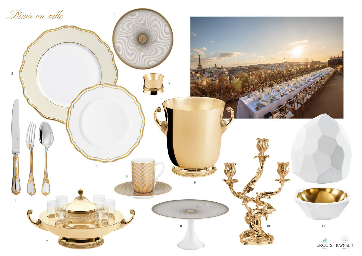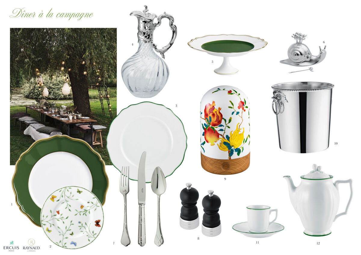 The sunny days are back, as are dinners in the countryside. The green invites itself to your table with the naturalism of Harmonia, the softness of Histoire Naturelle, all sublimated by Ercuis holloware and cutlery.